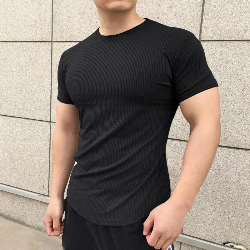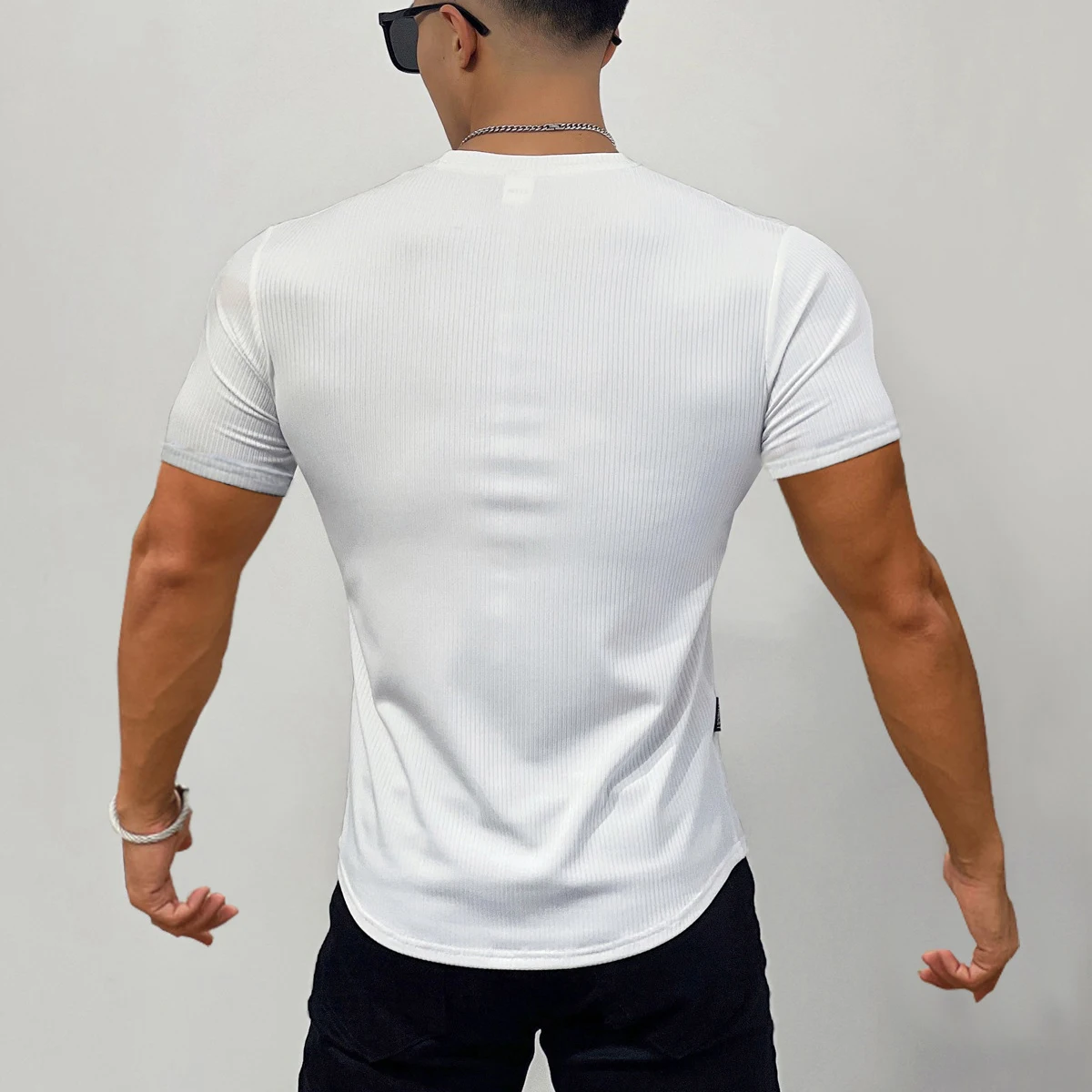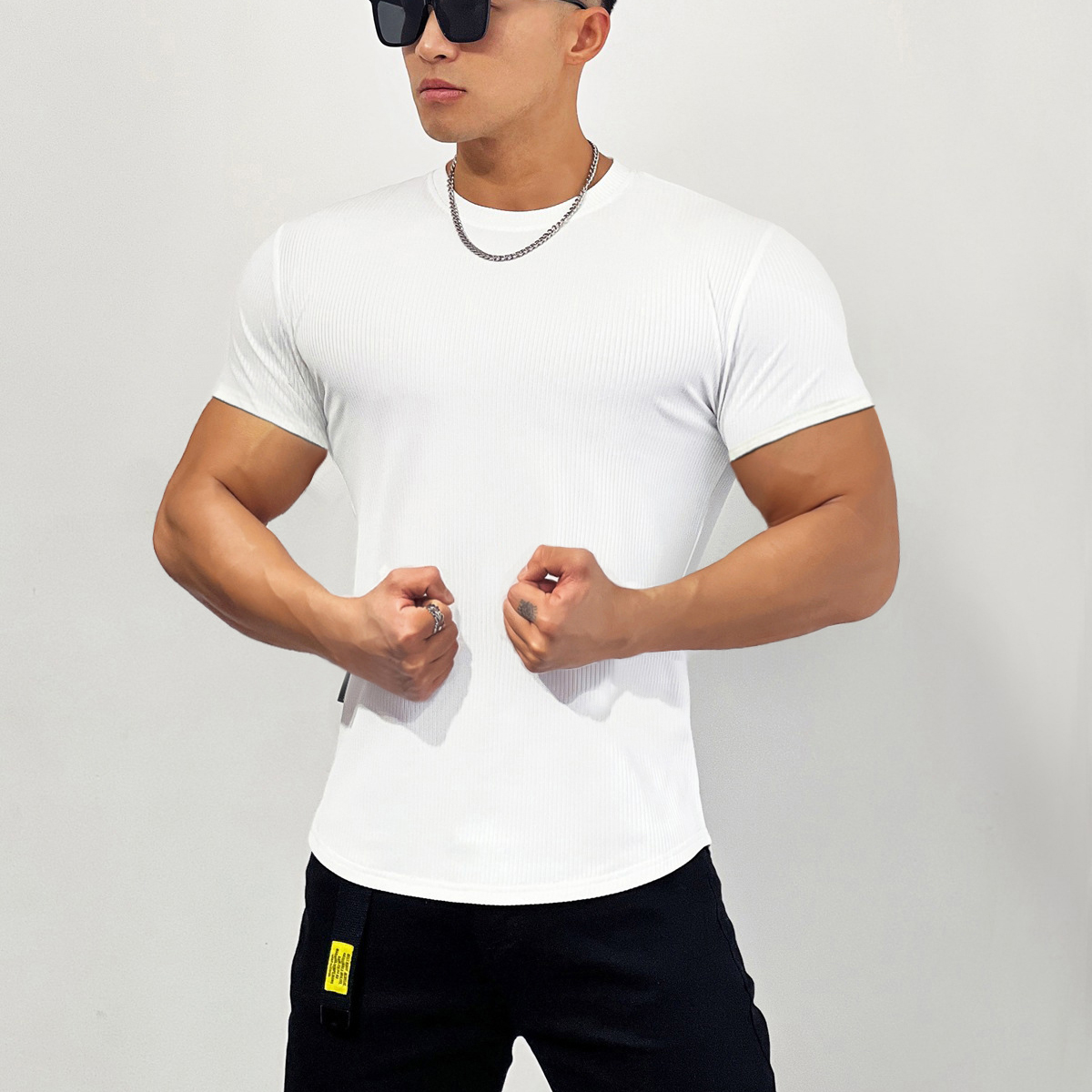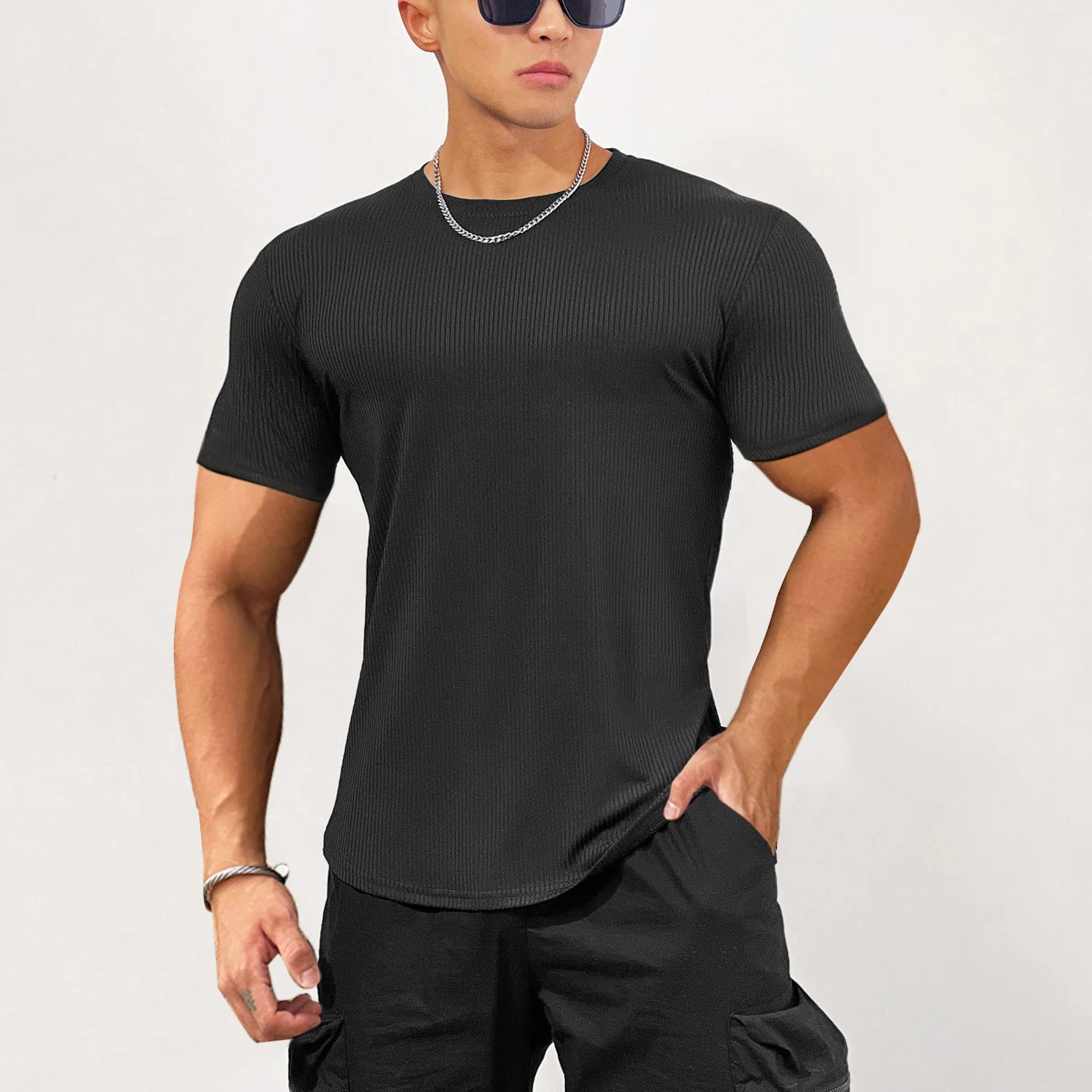 Men's Muscle Shirts Short Sleeve Casual Slim Fit Workout Tshirts Striped Curved Hem Light Weight Elastic