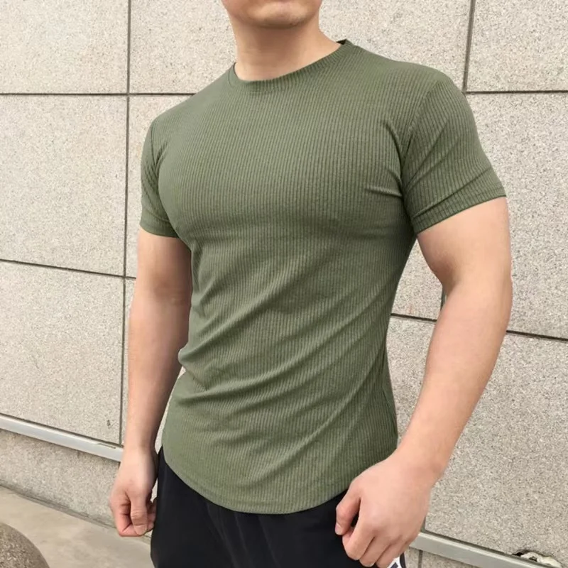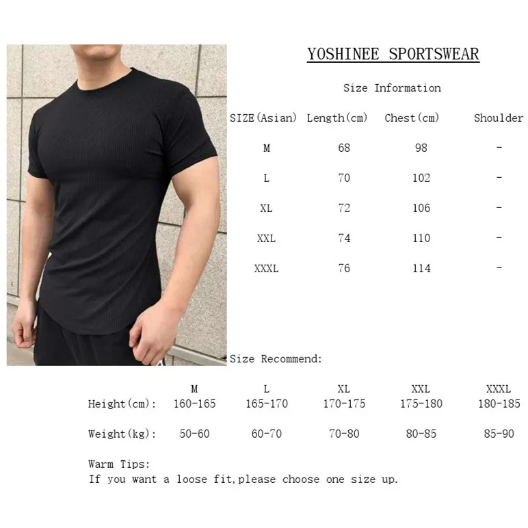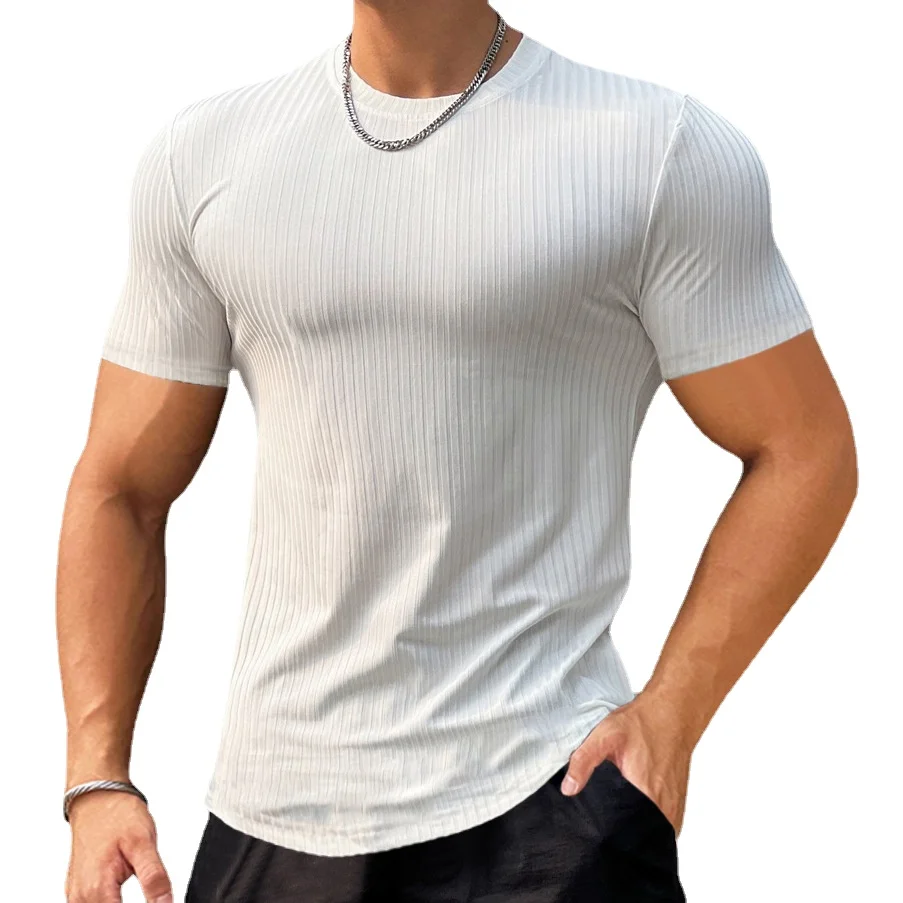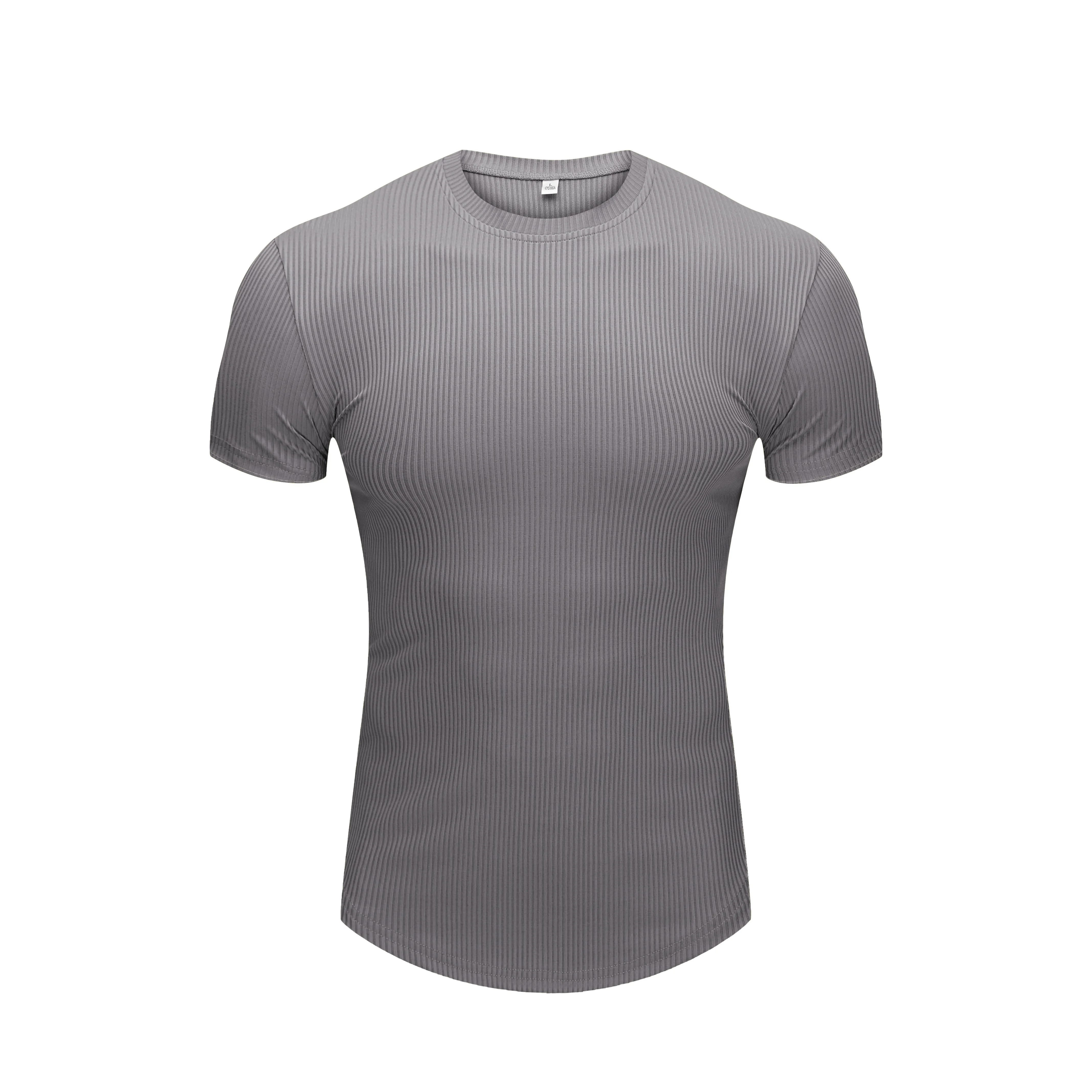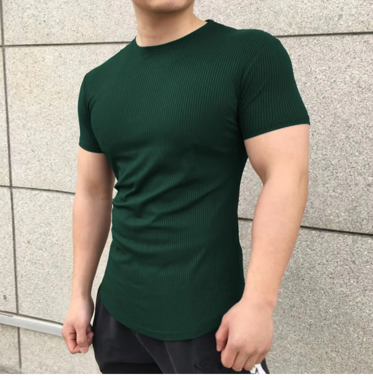 Men's Muscle Shirts Short Sleeve Casual Slim Fit Workout Tshirts Striped Curved Hem Light Weight Elastic